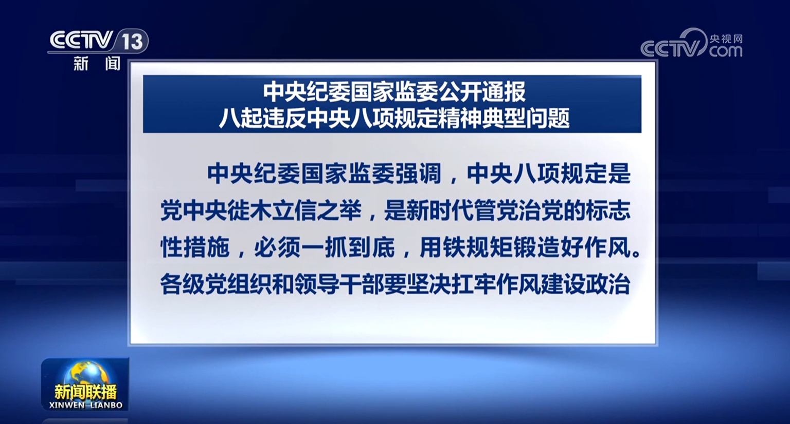(新闻联播):日前,中央纪委国家监委对8起违反中央八项规定精神典型问题进行公开通报。